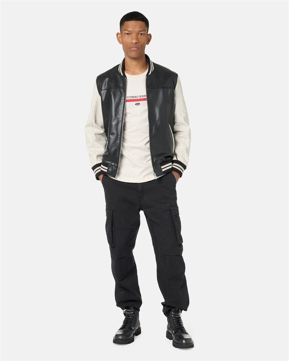 Varsity jacket realizzata in pregiata pelle dagnello nera con maniche in primo tessuto a contrasto bianco, per un effetto dinamico e moderno. Collo, polsi e fondo in costina con righe a contrasto che richiamano la palette cromatica del capo. Sulla manica sinistra spicca una stampa embossed del logo Iceberg, mentre sulla manica destra è applicato un patch ricamato con il logo, dettagli che sottolineano lidentità distintiva e la cura artigianale del giubbotto.