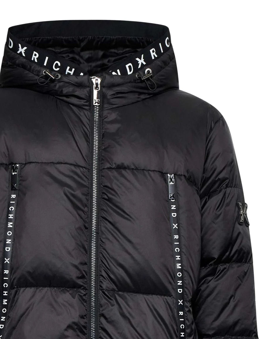 Piumino con cappuccio regolabile, chiusura zip a doppio cursore e tasche verticali con nastri logati. Il design trapuntato dona volume e protezione, mentre i dettagli grafici su cappuccio e maniche aggiungono un tocco distintivo. Ideale per un look urbano e funzionale.