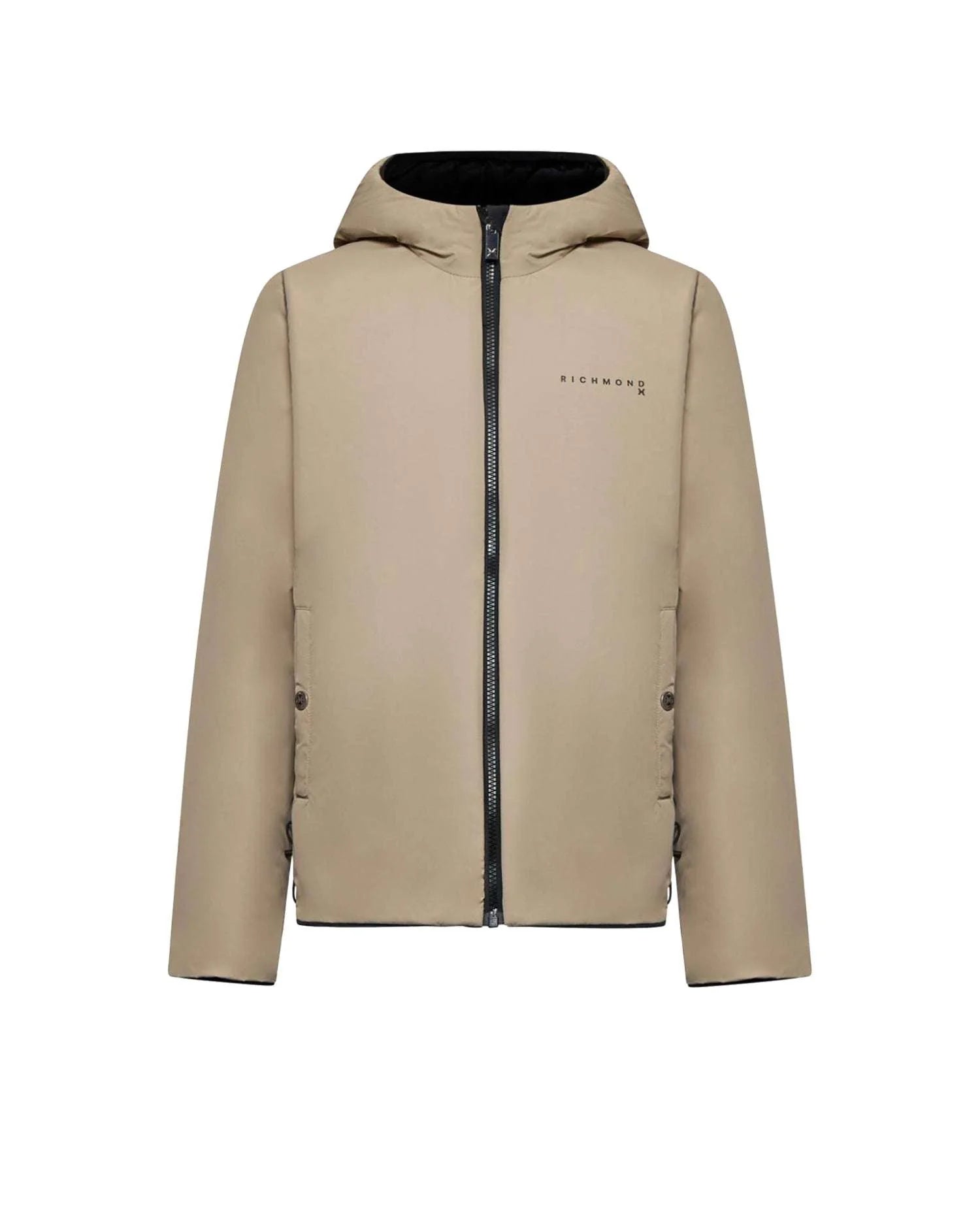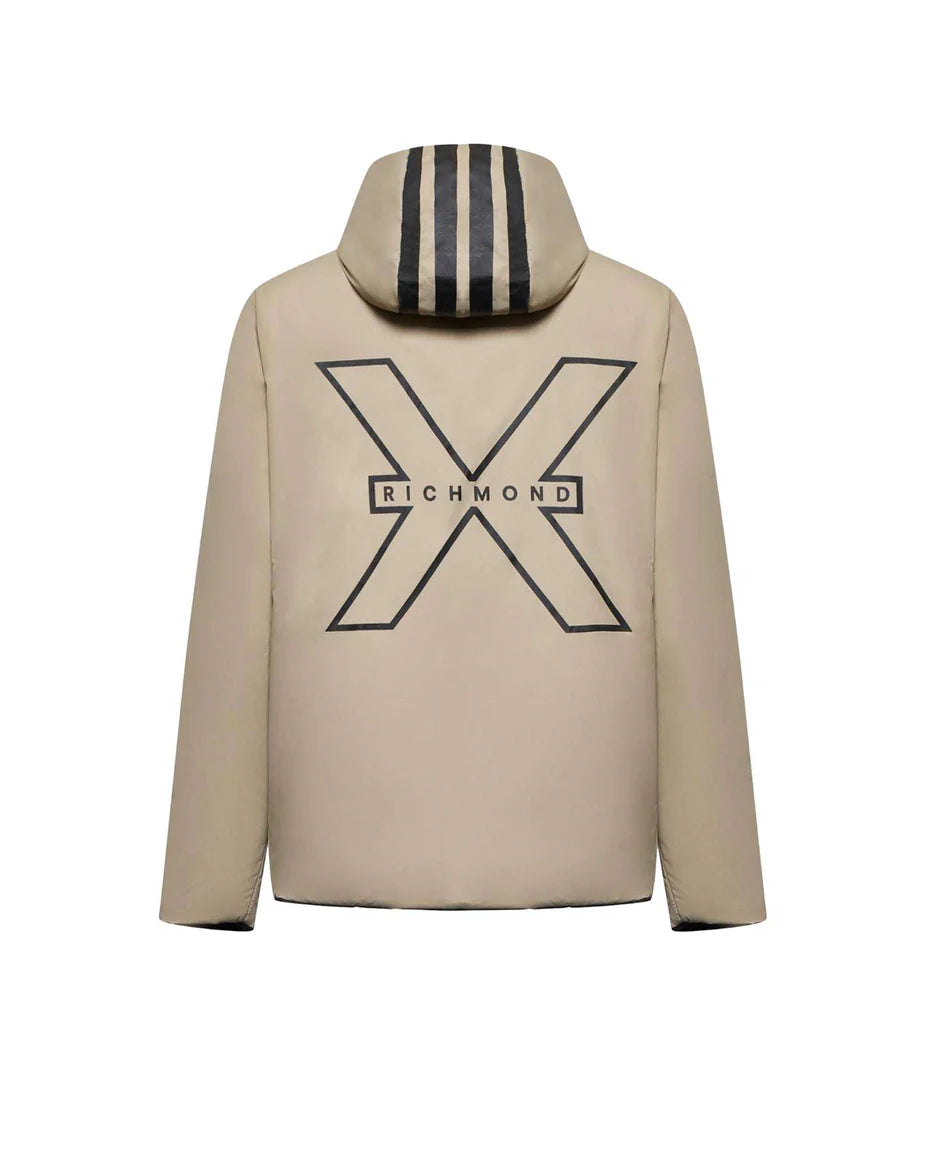 Giubbotto reversibile uomo con cappuccio dal taglio essenziale, ideale per completare look casual e streetwear. Dotato di zip frontale a tutta lunghezza, tasche laterali con chiusura a bottone e stampa grafica sul petto, unisce funzionalità e stile urbano per un capo pratico e versatile.