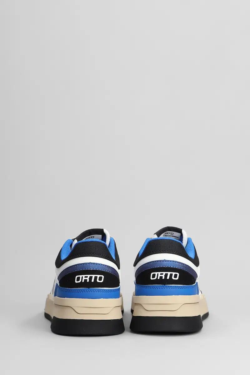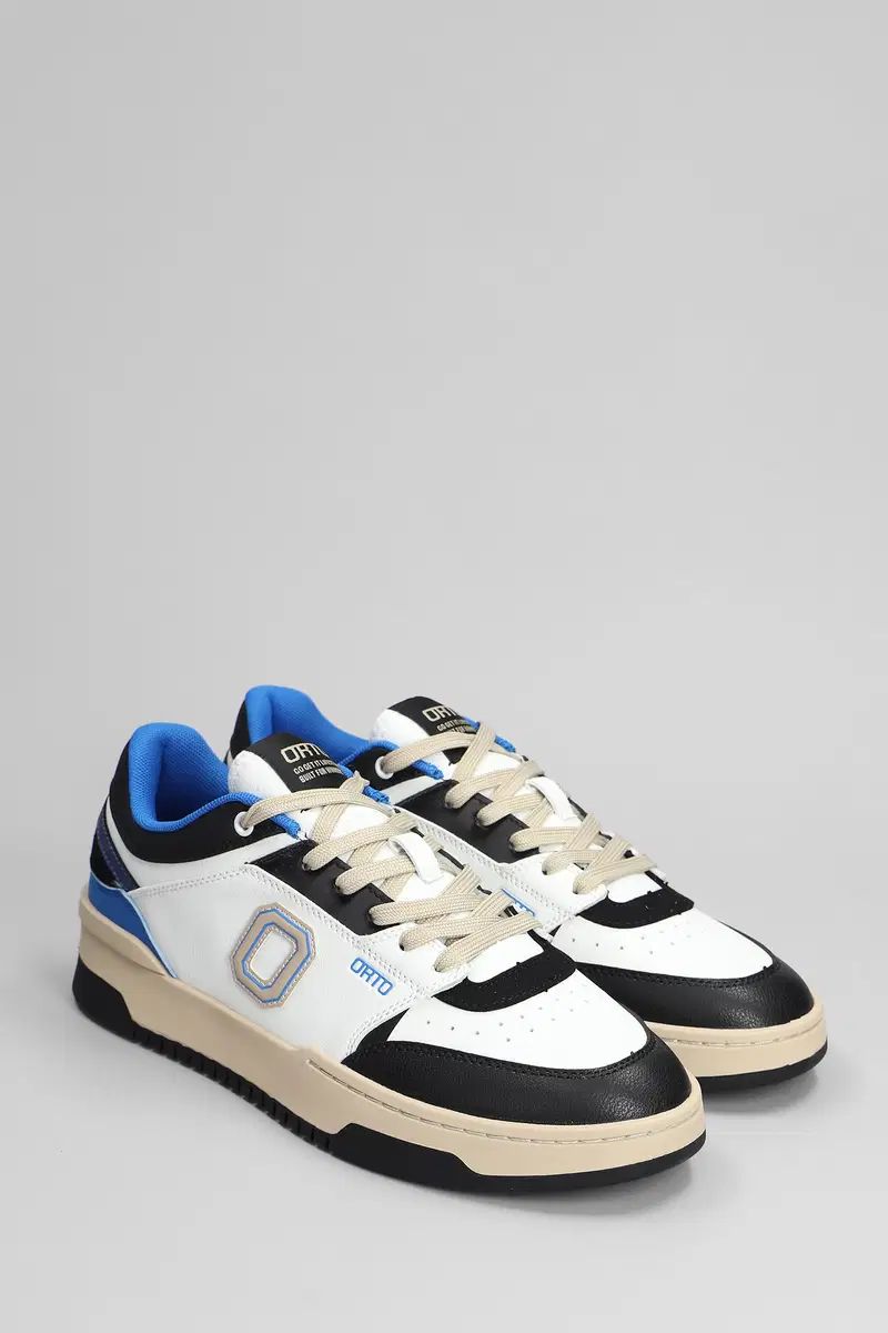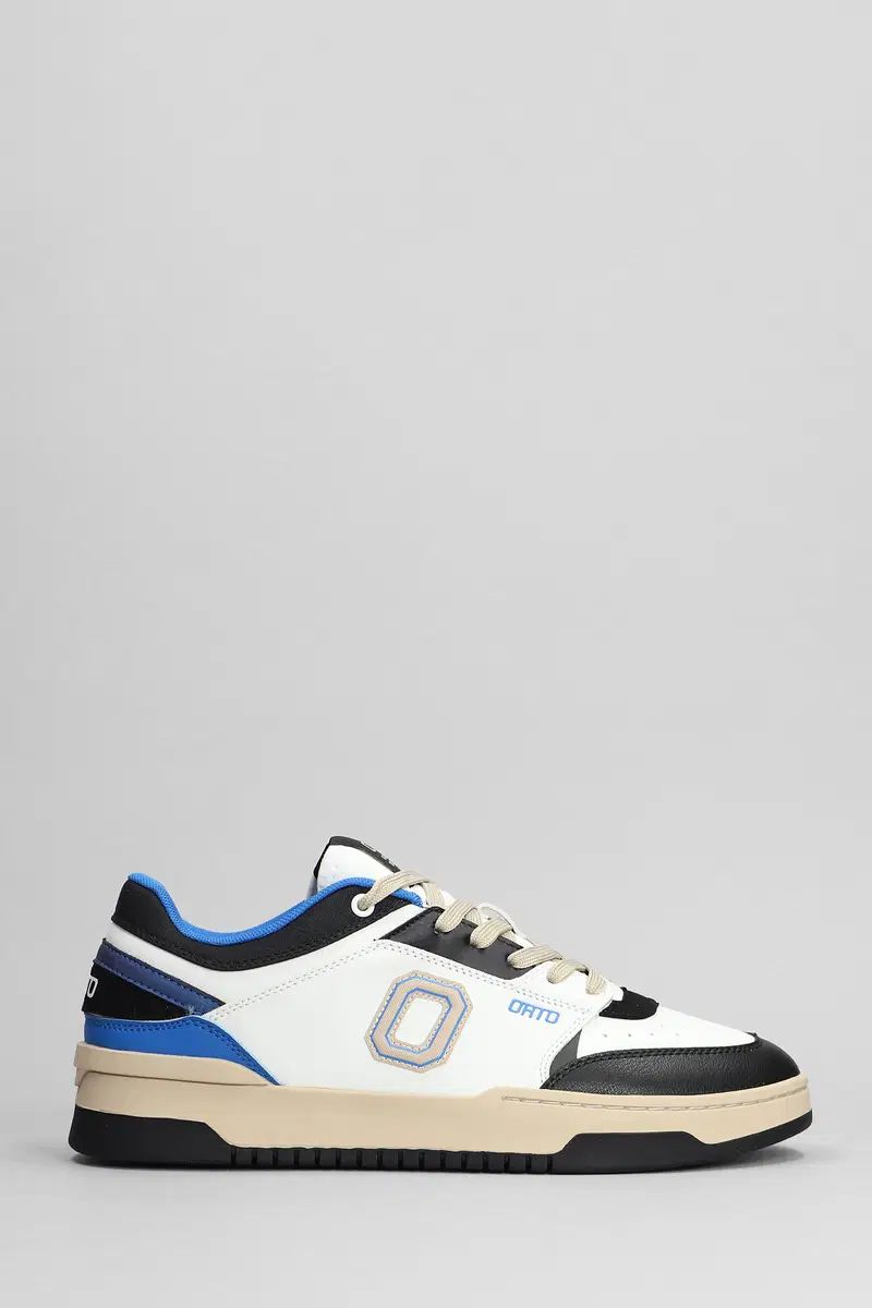 - Pelle bianco spento con inserti in microfibra neri e blu